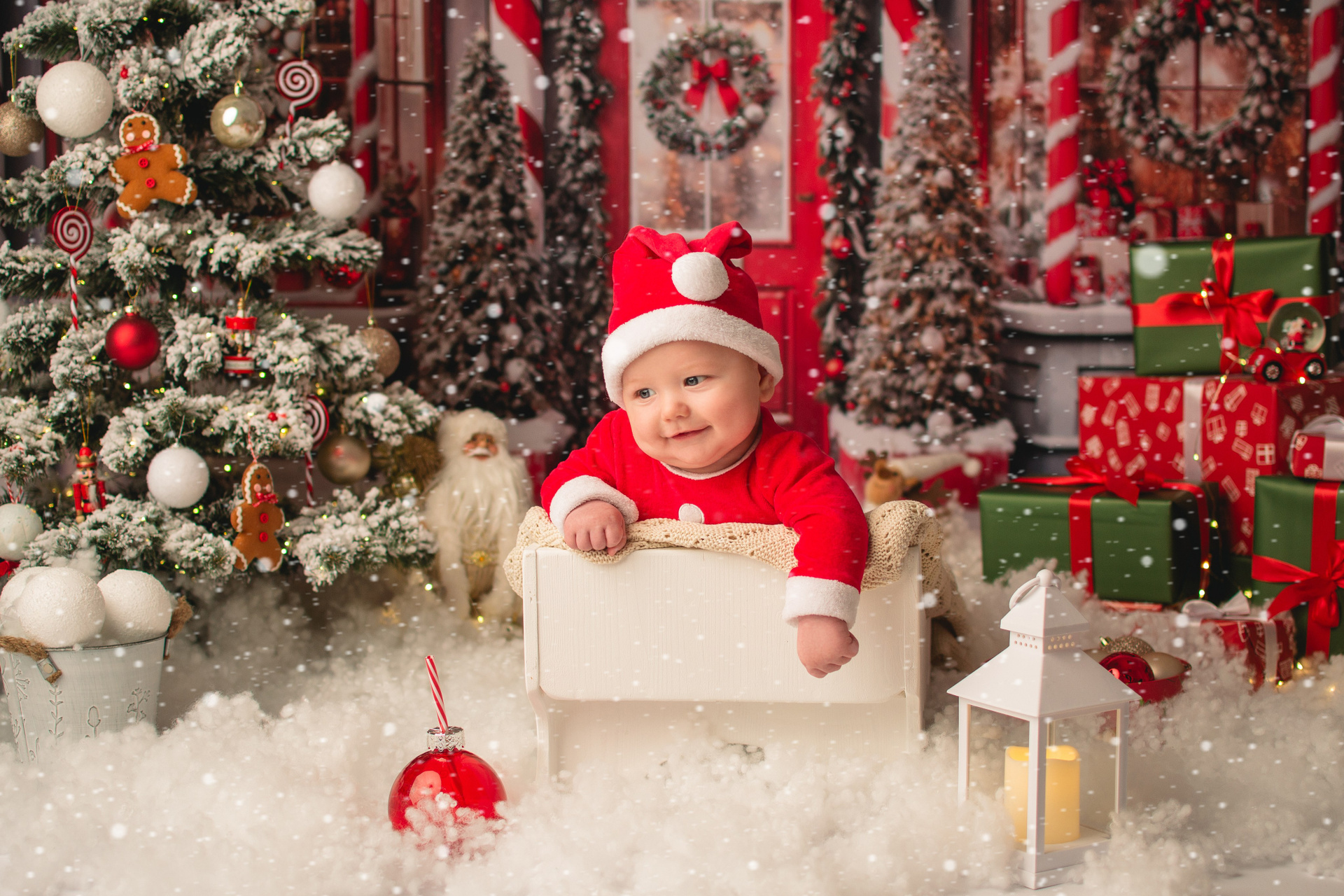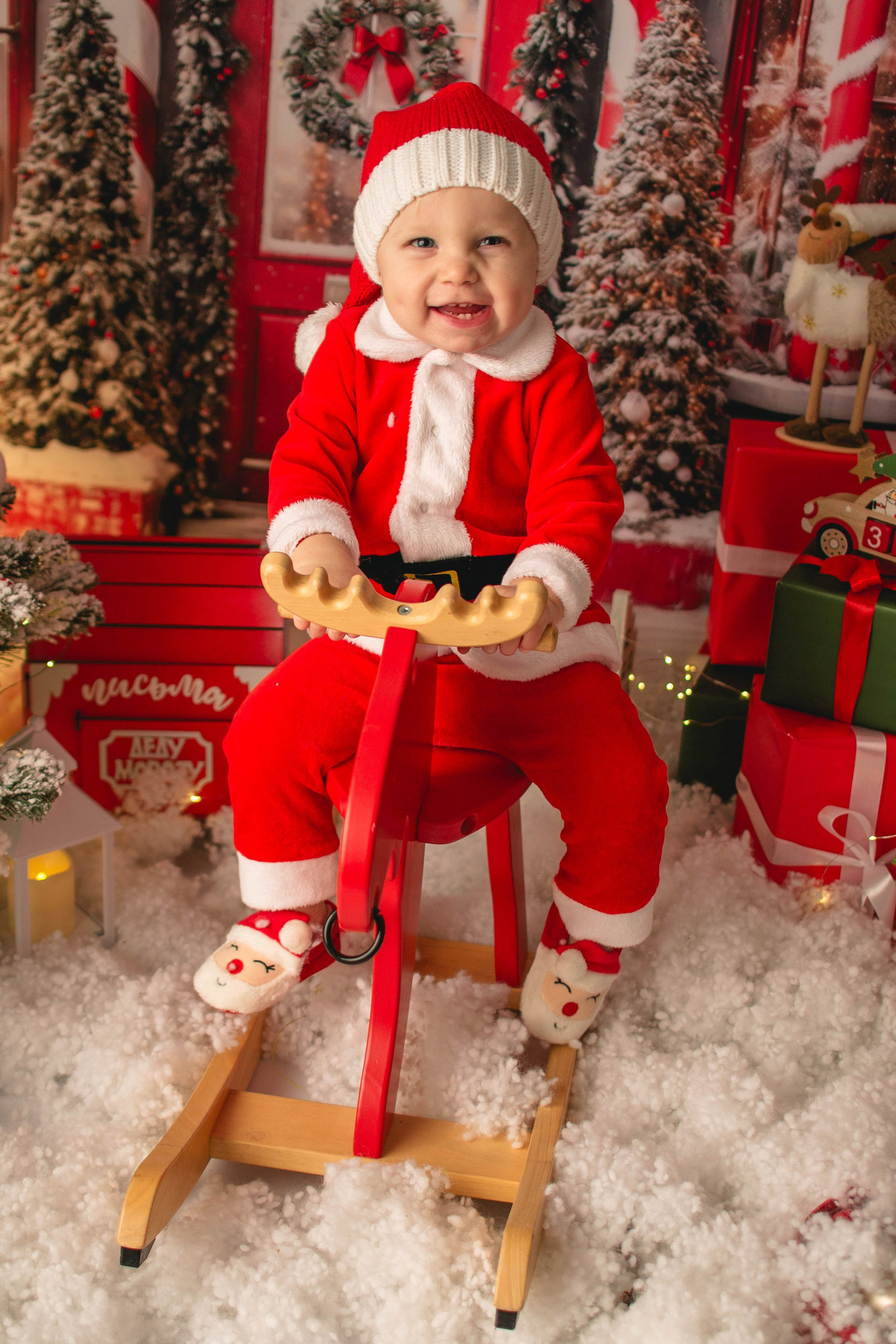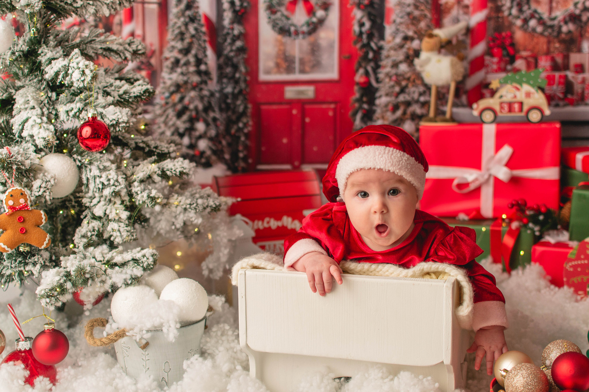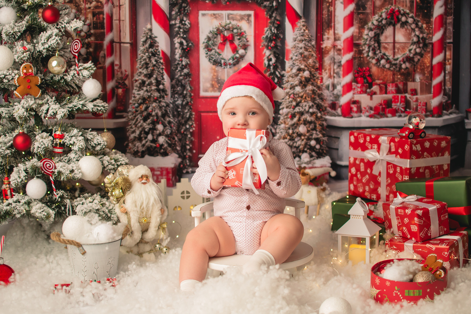 Белоснежный камин, мерцающие гирлянды, рождественский венок и пушистая ёлка с бордовыми и золотыми акцентами создают идеальное пространство для душевных снимков.