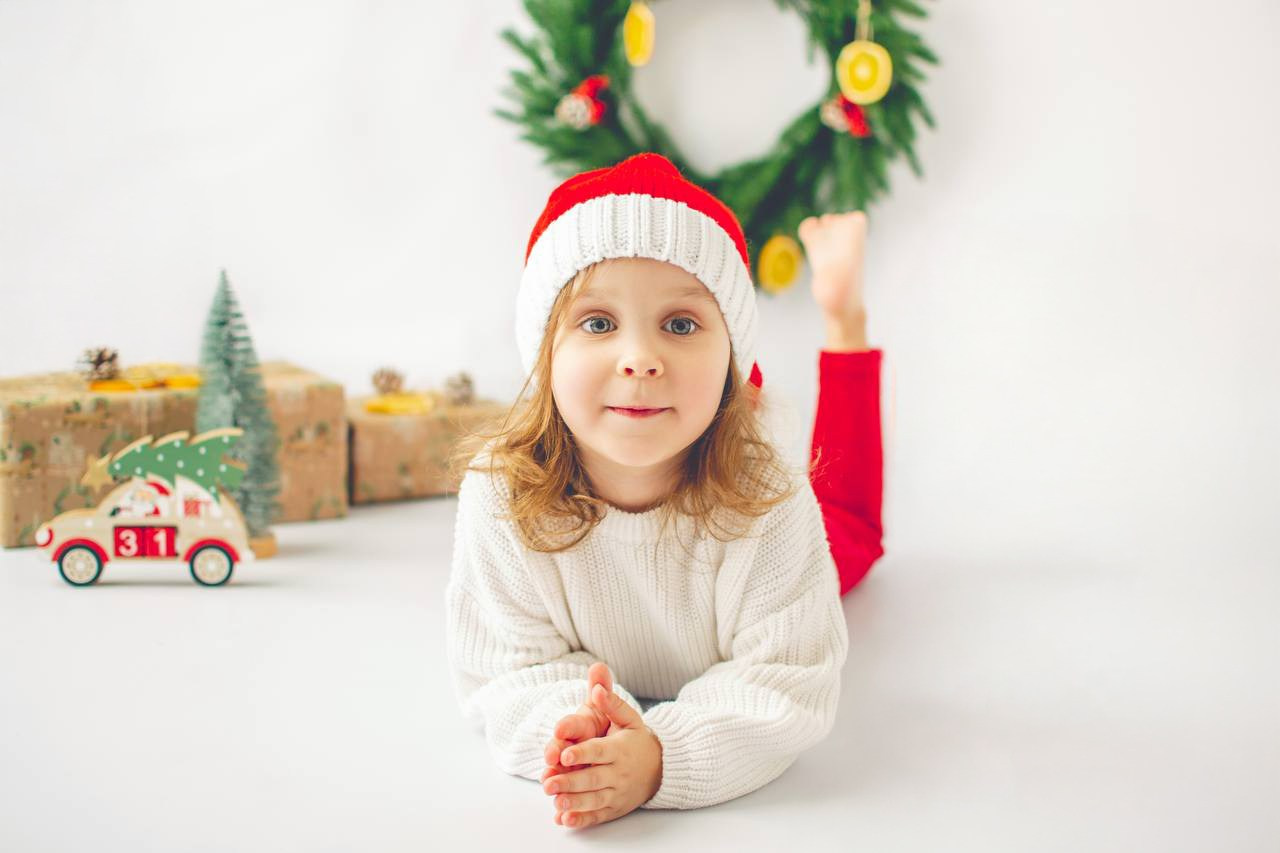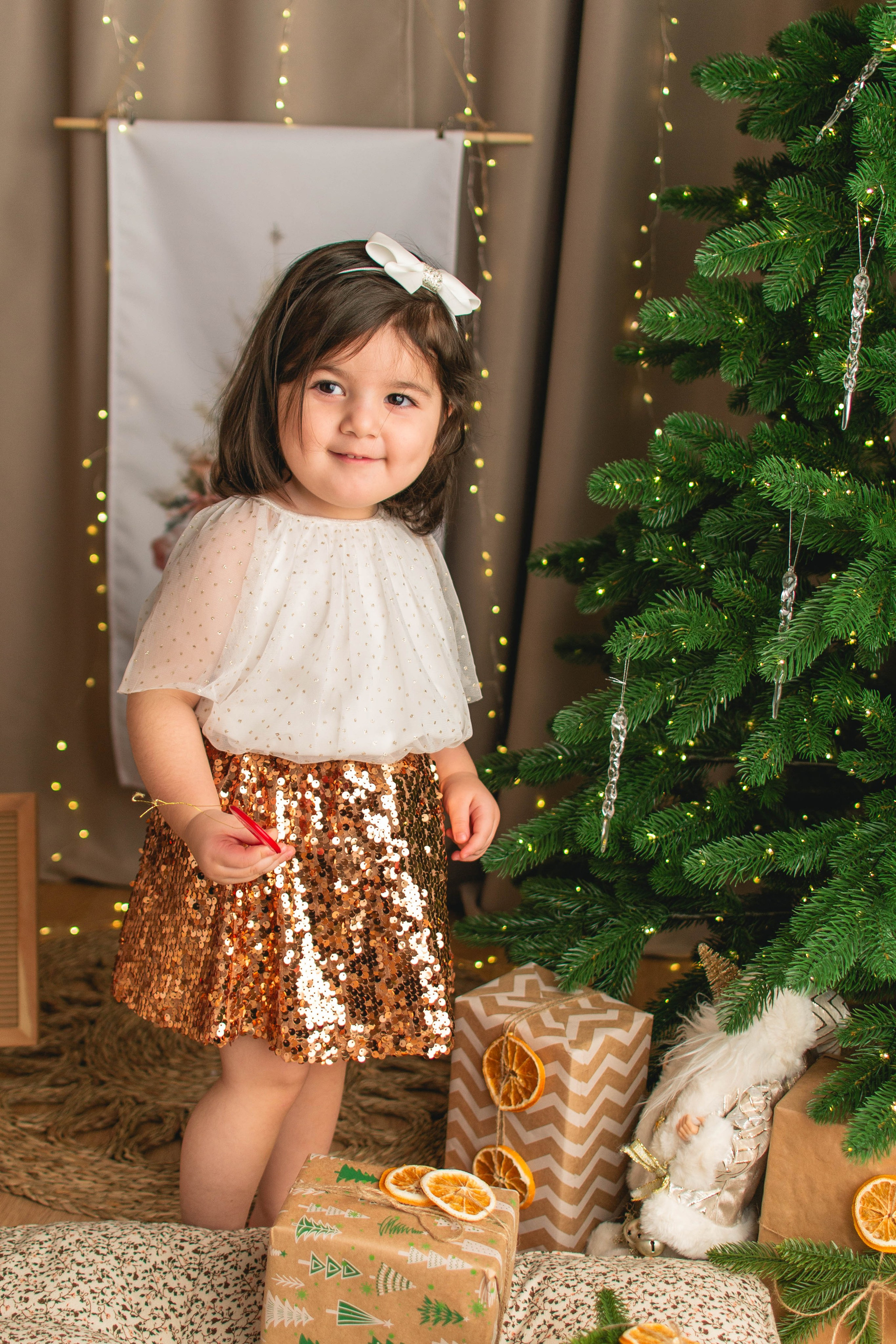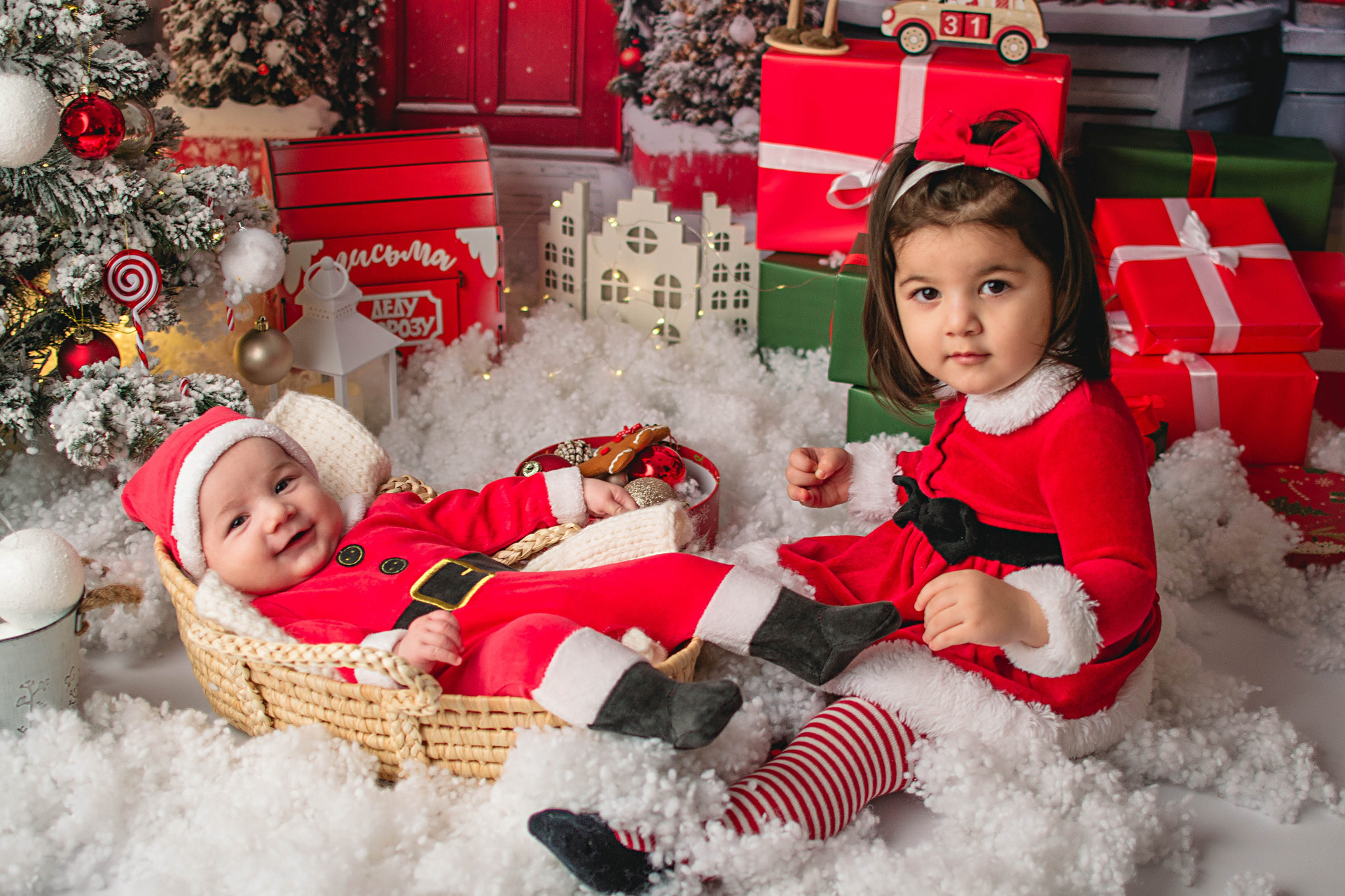 Белоснежный камин, мерцающие гирлянды, рождественский венок и пушистая ёлка с бордовыми и золотыми акцентами создают идеальное пространство для душевных снимков.